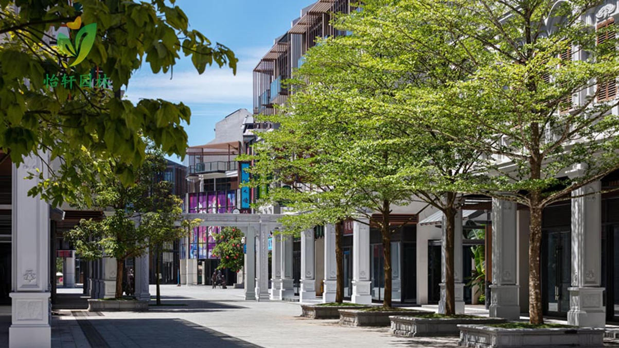 广东怡轩园林绿化公司通过“村头一棵树”点景榕树、雨树树阵、文化牌楼等景观元素,铺陈文化中轴的景观序列,营造南洋美丽汇核心精神轴线。南洋古街上的特色酒店在建筑元素上沿用了海南传统老宅——陈家宅、符家宅、韩家宅、林家宅的部分元素,复刻其精华,这是对前辈的致敬,也是文化的再生。文化融汇中西,应承了南洋文化荟萃致辞,南北内街一脉相承,又进行传统和现代的呼应,简约时尚的建筑主基调,商业外墙挂着形制考究的南洋风情招牌,地面上设置的文化地雕及特色花砖,街头巷尾的情景雕塑及景观装置,就像是把历史上有关南洋的美好凝固成了画片,缕缕南洋情怀浮上心头……灯火通明的街道,来来往往的人群,展示一幅安居乐业的生活画面。扬帆广场以南洋船和灯塔为主景,营造扬帆起航的意境。