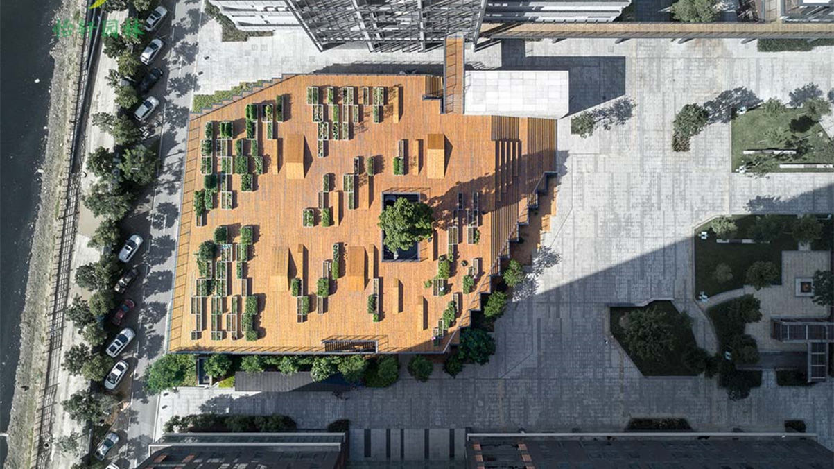 在原有的园区整体布局中,内庭院的西侧是一个室外停车场。为了改善庭院的空间效果和保留停车功能的需求,停车场的上方增添了景观大平台。通过台阶的设置,大平台成为内庭院空间的延续,从而形成不同标高的公共空间体系,而台阶也成为内庭院举办户外活动时的观众座椅。平台上布满了错落有致的混凝土种植槽,不同喜好的人栽种不一样的农作物和灌木花草,形成有趣生动的景观。平台上的大洞口为下面的停车场提供良好的采光,而洞口中间的香樟大树也为停车空间提供绿意。