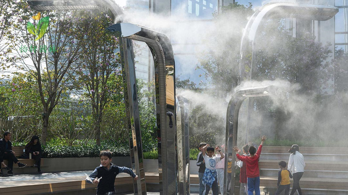 位于南山区深南大道的万象天地是深圳当下最具人气的商业街区,随着季节或节日的更替,这个时尚街区也会随之切换使用场景。面对场地多样的使用人群以及频繁切换的使用场景,我们试图为该屋顶花园提供一个可聚可散的方案。我们以“水滴”既“有形”又“无形”的特性为灵感,设计了一座既能满足高容量商业活动需求,又能兼容个性化生活方式的“水滴花园”。水滴花园整体呈聚合的形态。花园中央是一处面积约500㎡的下沉广场——水滴广场。作为承载各类公共或商业活动的聚合空间,广场的边界由不同高差的台地围合而成,成为面向广场的天然观众席。我们通过巧妙的种植设计,台地与广场若即若离,忽远忽近,呈现出丰富灵活的空间变化。我们在水滴广场内设计了一组“水滴”装置 ,作为花园的视觉焦点,强化了花园的聚合性。同时,水滴装置也是一组能够与人互动的喷雾装置。白天,这里是孩童尽情嬉戏的场所。夜晚,水滴般的灯光跃然于深色的铺装基底,在雾森的缭绕下犹如水中的星空,这份浪漫也吸引了年轻人的参与。